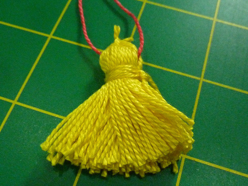- These tassels should have a chubby look to them. We used a double strand of floss, wrapping it around the cardboard form 34-36 times.
