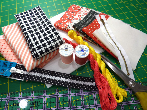 - Scraps, Jolly Bar pre-cuts (what we used for one pouch) or ⅛ yard cuts of THREE different coordinating 44”+ wide quilting weight cottons for the exterior panel and the zipper tabs