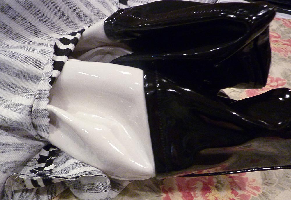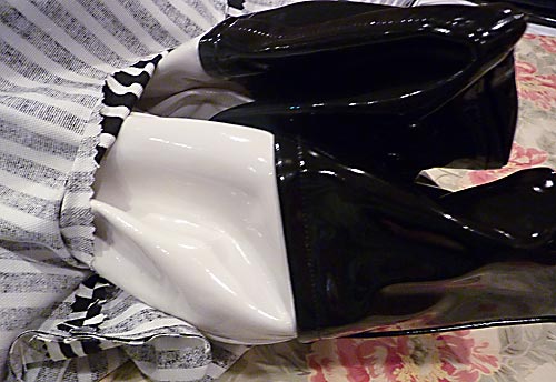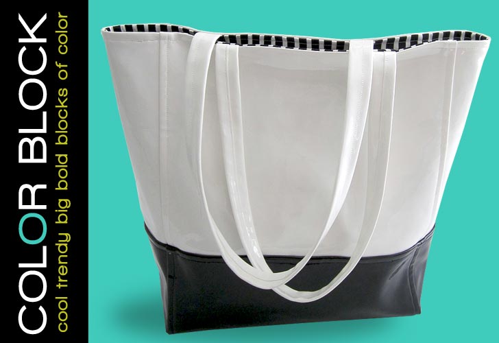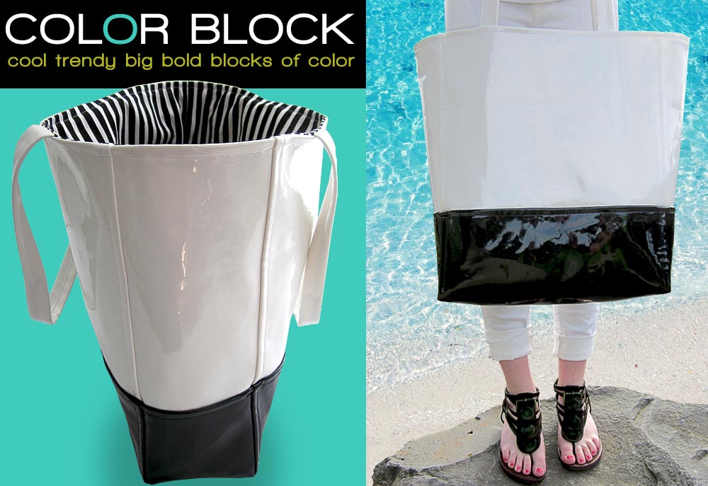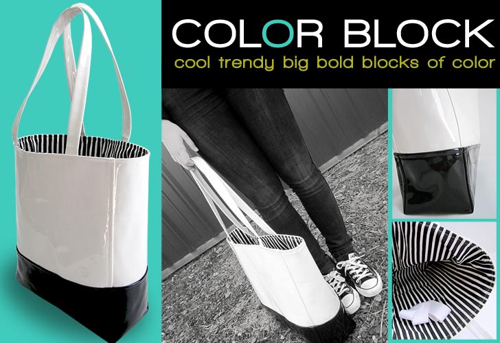 Color block is the fashion statement this spring. We’ve spotted the style on everything from pretty pillows to darling dresses to terrific totes… like this one. In order to give you two trends for the price of one, we executed the signature color block style in one of the popular new laminated fabrics, choosing bold black and white patent leather vinyls from Fabric.com. Stylish and sophisticated, our tote design is actually very easy to make, even with its posh cotton lining and double shoulder straps. The bag was sitting on the end of my work table for a couple days, and every single person who walked by had to pick it up, admire it and try it on for size… even the guys!