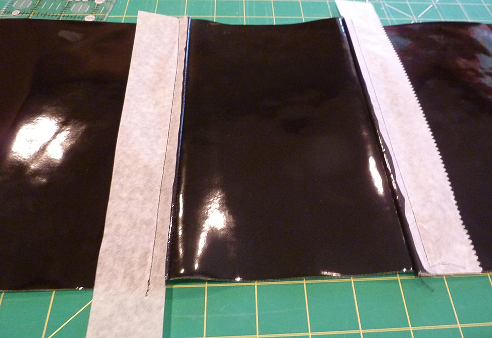 NOTE: When you topstitch this seam, you’ll notice the vinyl is not super pliable; you’ll need to futz with it a bit to get it to lay flat under the needle. This is why we stitched the other three seams with the vinyl flat!