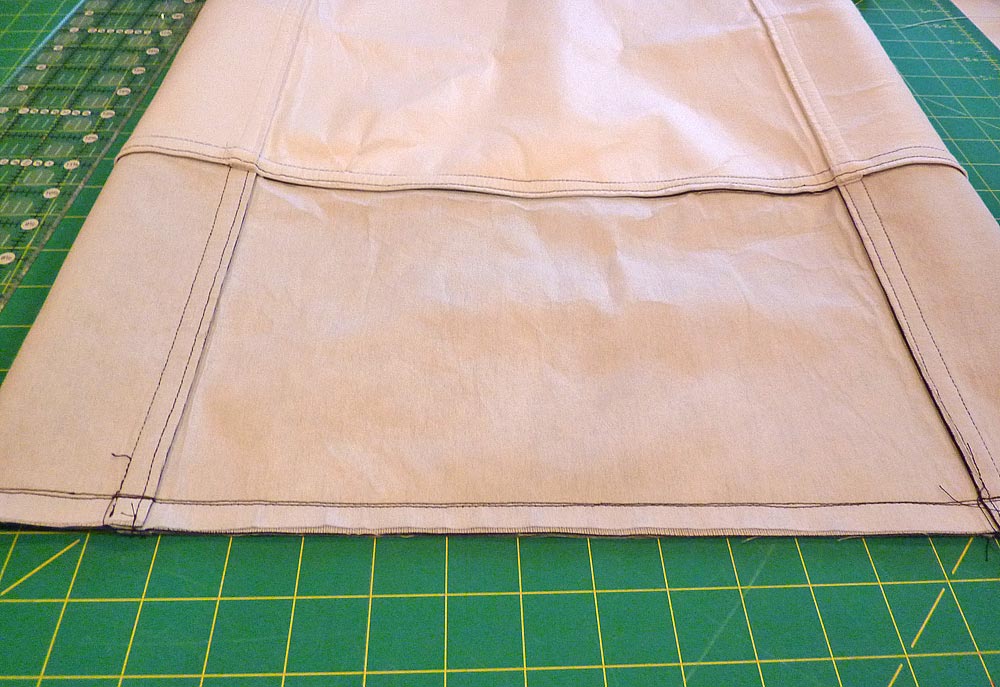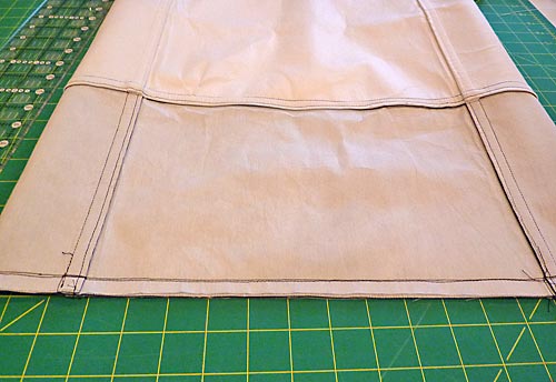 6. Turn the bag right side out, and with the machine still threaded with thread to match the bottom bag panels, topstitch the seam allowance in place within the bottom panel. As above, place wax or parchment paper down and stitch approximately ¼” from the original seam.