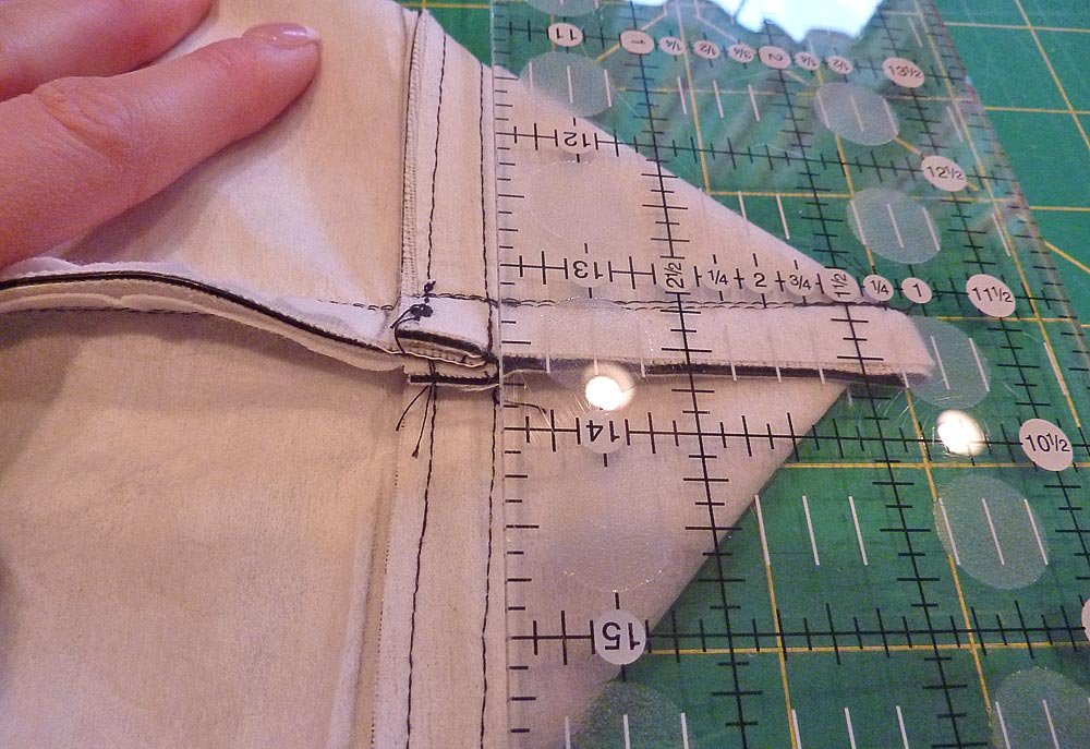 12. Our bag is designed to have 5″ sides and base. To create this width, you need to figure your boxed corner seam at half that finished width. Therefore, in our sample, we measured 2½” from the tip of each corner peak.