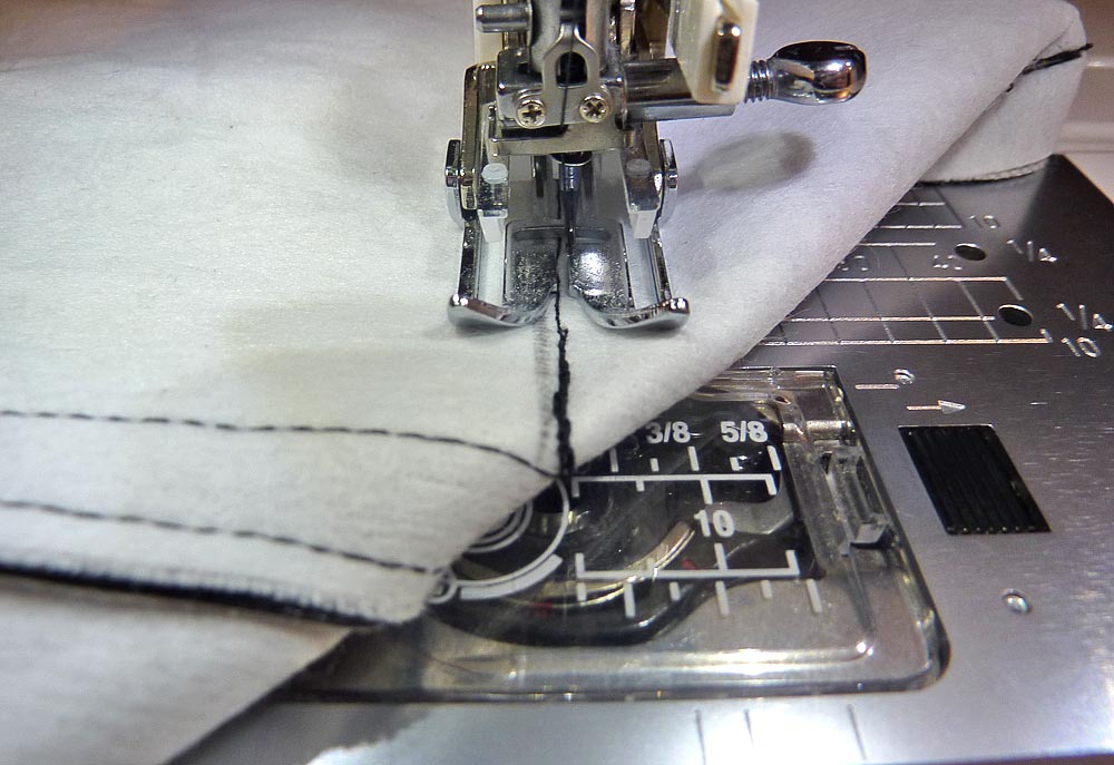 5. Before you turn the bag right side out to topstitch, you will need to clip the seam underneath at the intersections where the side seams were topstitched. Otherwise it will be too thick to fit through the machine.