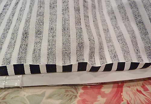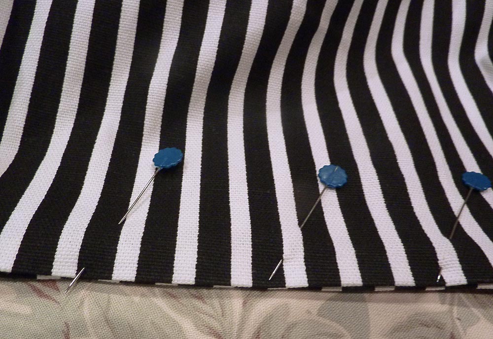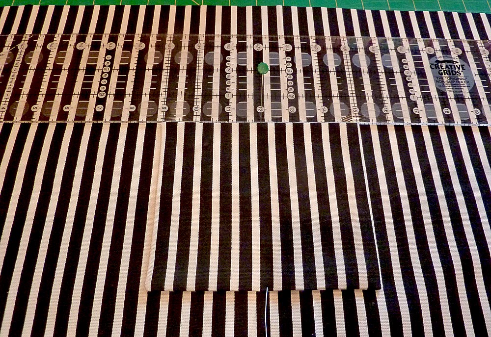 6. Pin the pocket in place on one 19″ x 18½” lining piece. The pocket should be centered side to side and 5″ down from the top raw edge. Adjust slightly if needed in order to match the stripes on the pocket with the stripes on the main lining piece.