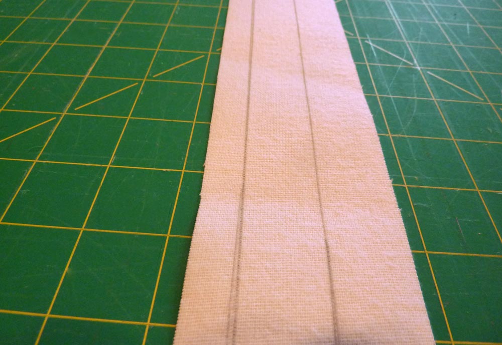 3. With ruler and pencil measure 1″ in from the right side and draw a line all the way from one end to the other. Then, measure ½” in from the left side and draw a second line from one end to the other.