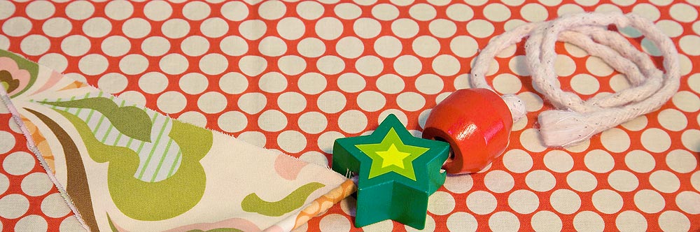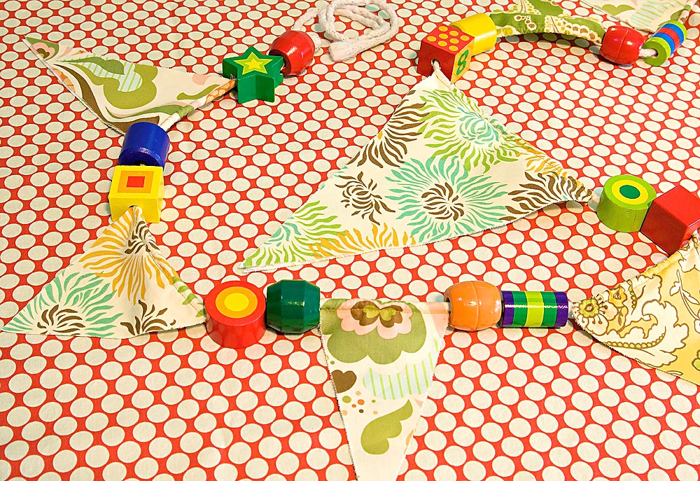Wonder where we got the awesome wooden beads in our sample? They are little kid’s stringing beads. Check your local educational toy store for the best selection. They come in both plastic and wood; we chose wood because the bright painted designs looked great with our fabric scraps.