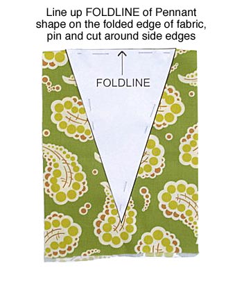 - Pin a triangle pennant shape on top of the fabric, lining up the edge labeled FOLDLINE on the paper pattern along the folded fabric edge.