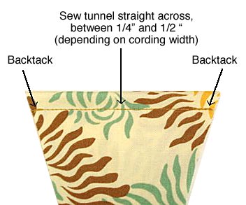 - Remove the paper pattern from the fabric and stitch a seam that is ¼”- ½” (depending on the width of your cord) from the folded edge, back-tacking at the beginning and end of the seam line to secure and strengthen. This creates the tunnel for stringing your pennants onto the cording, so make sure it is wide enough for the cording to pass through.