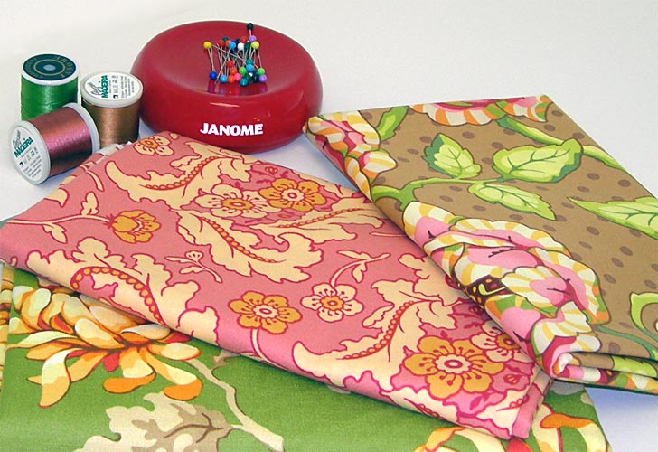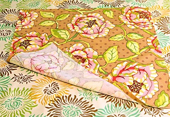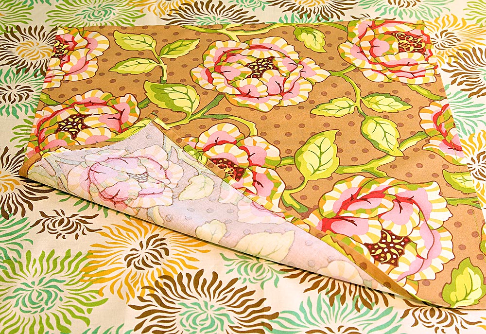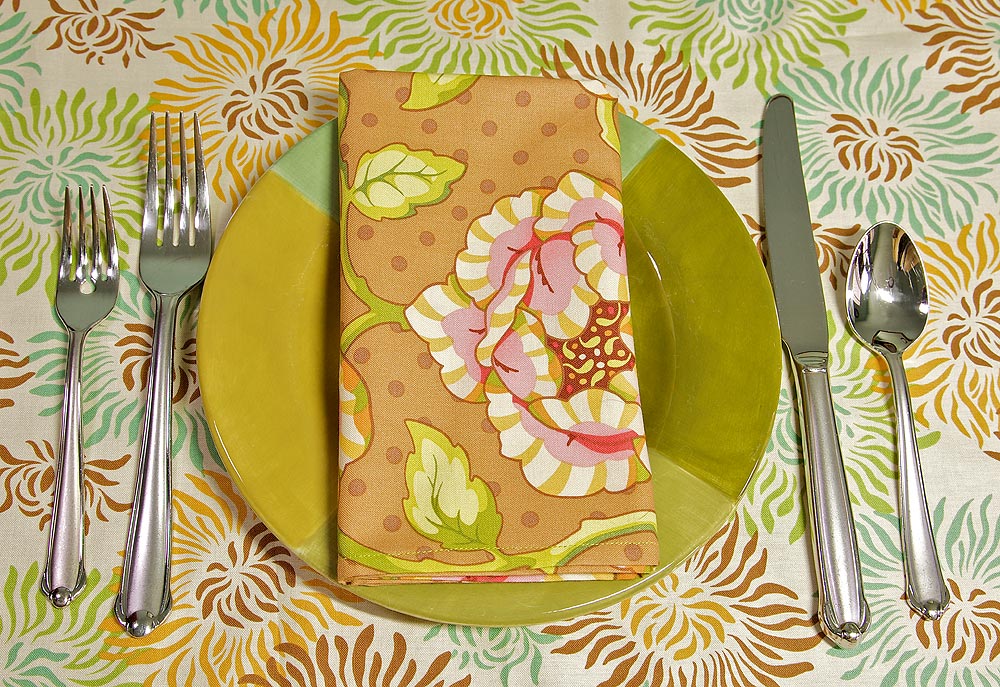 - Fabric(s) for napkins: ½ yard of 45″ width fabric will yield two napkins (1½ yards of fabric total for six napkins); we originally used Heather Bailey’s Freshcut in Cabbage Rose-brown, Finery-pink and Painted Mum-olive/gold.