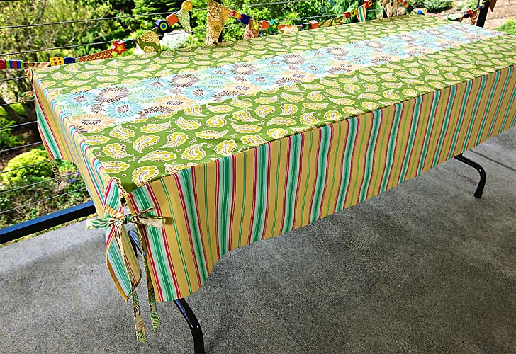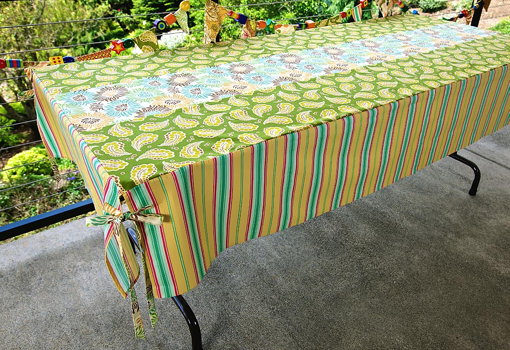 - Lay the finished tablecloth on top of table and tie each corner together to help secure it to the table.