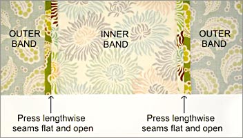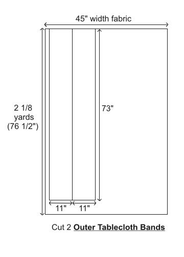 - With right sides together, pin the second Outer Tablecloth Bands to the opposite 73″ edge of the Inner Tablecloth Band, and sew together using a ½” seam allowance.