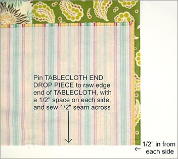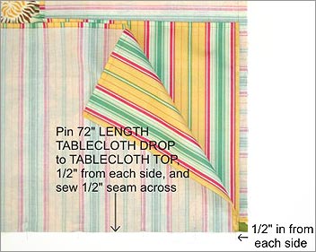 - Pin the 72″ wide Tablecloth Drop pieces right sides together with the tablecloth top along each long side, again lining up the raw edges and leaving a ½” space on each side.