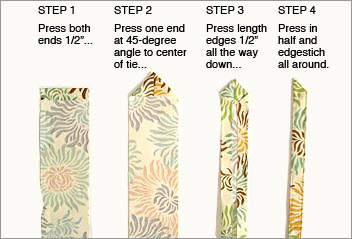 NOTE: You can simply leave the corners and seam allowances pressed as described above, or you could topstitch around the entire perimeter of the tablecloth to insure the seam allowances and the corner points stay exactly where you want them. - To make the Side Ties, take one of the Side Ties strips and press back each end ½”. Next, fold both corners of one of these ends at a 45° angle towards the center of the tie as shown in the diagram below. Then, press back each long edge ½” so they meet in the middle. Finally, press the entire tie in half lengthwise and edgestitch around the entire tie.