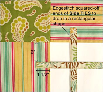 - At each of the four corners of the Tablecloth Drop, pin the squared-off end of each finished Side Tie to the Tablecloth Drop, so they are 2″ below the seam and 1½” in from the edge. Pin in place, the secure to the drop panels with a simple rectangular bo stitch.
