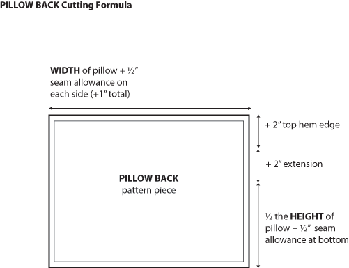 Height of cut piece = ½ finished pillow height + ½” (bottom edge seam allowance) + 2″ (extension amount) + 2″ (for double turn hem edge).