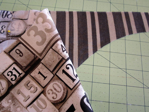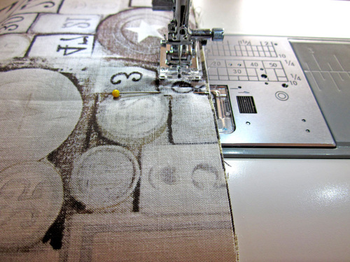 - Find the top and bottom apron panels. Place them right sides together, aligning them along one 33″ edge. If using a directional motif as we did, make sure you are aligning the bottom of the top panel and top of the bottom panel (oh yeah… that hurts my head). Pin in place.