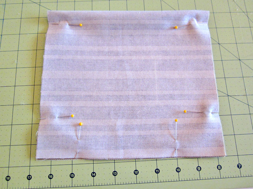 - Pin along both sides and across the bottom, leaving a 3″ opening along the bottom for turning.