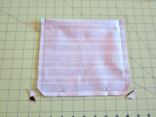 - Using a ½” seam allowance, stitch along both sides and across the bottom, pivoting at the corners and remembering to lock your seam at either side of the 3″ opening. Clip the corners at a diagonal, being careful not to cut into your seam.