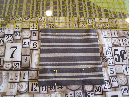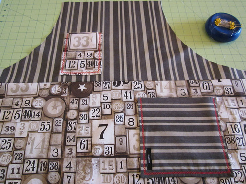 - Place the finished upper pocket on the left side of the apron front, 1″ above the horizontal top/bottom seam and with the upper corner 1½” to the right of the side armhole curve. We aligned the pocket along the ticking stripes.