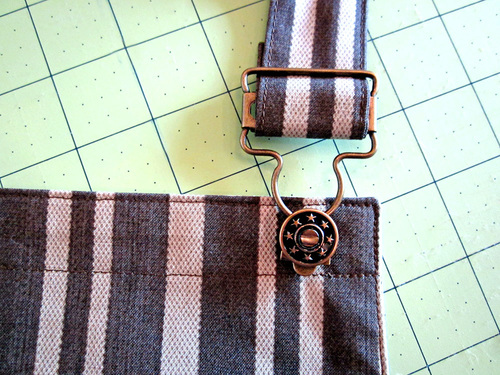 Cute suspender buckles on the neck strap are a perfect match for the retro style of our fabric choices. And, decorative stitches adhere both pockets in place and add a fun pop of contrasting color – we used bright red.
