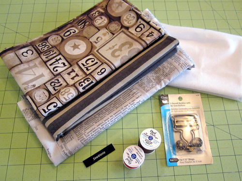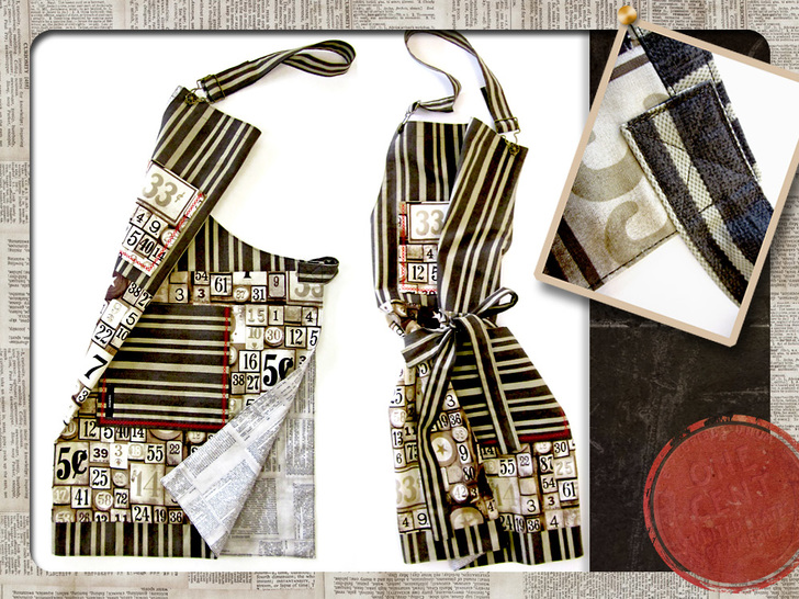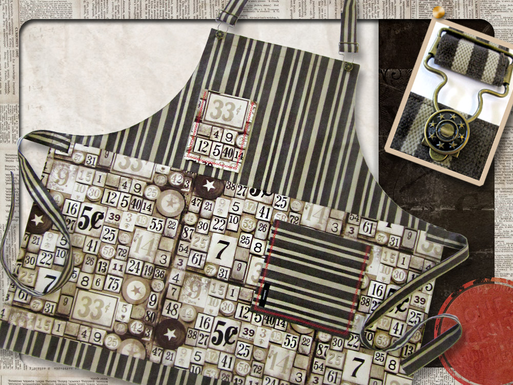 - ½ yard of 44″+ wide quilting weight cotton for the apron bottom and upper pocket; we originally used Game Pieces in Taupe from the Eclectic Elements Collection by Tim Holtz for FreeSpirit Fabrics