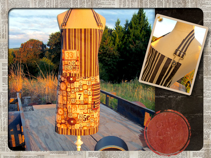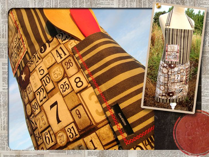 We particularly like Tim’s variable width Ticking Stripe. It’s a great blending fabric, and as you can see in our apron, you can run the stripes both horizontally and vertically within one project for added interest.