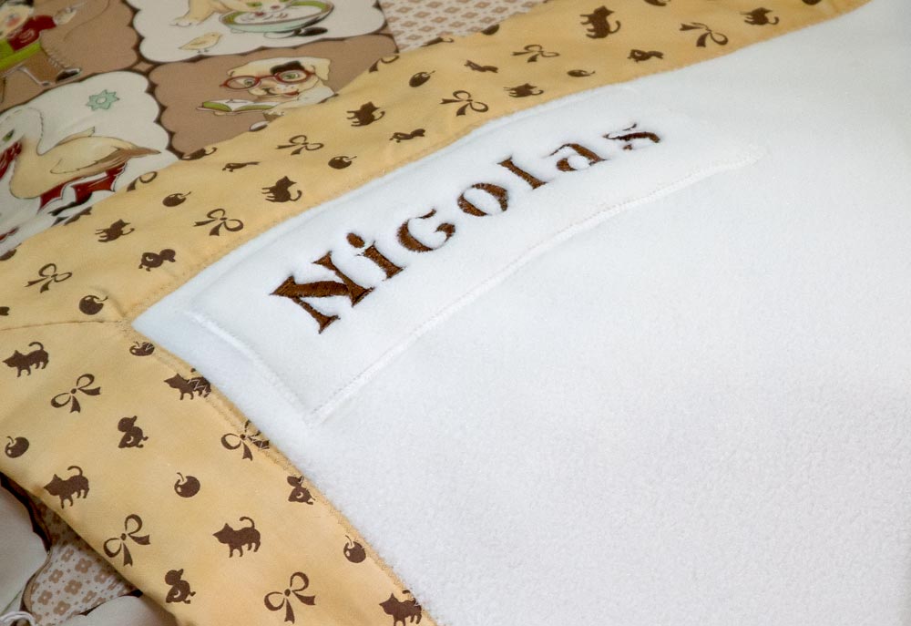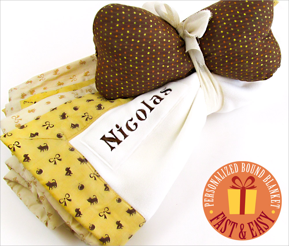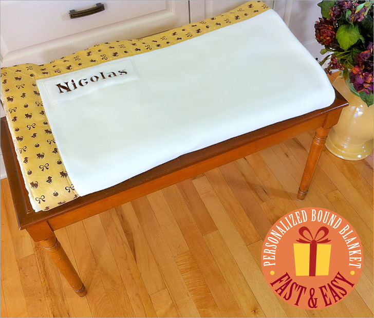 Our embroidered name is appliquéd in place to keep both sides of the blanket as smooth as possible. If you don’t have an embroidery machine, another idea would be to create initials from the same fabric used for the binding, appliqué these to a patch of fleece, and then stitch the patch in place as we did.