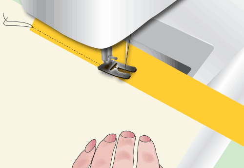 10. Bring the project to your machine, and starting in the middle (where you started pining), stitch the binding to the project, staying as close to the edge of the binding as you can. Go slowly and make sure you catch both sides of the binding in this one seam.