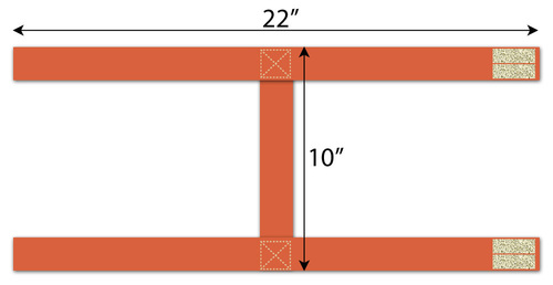 - Place the 10” length across the 22” lengths at the exact center. Pin the ends of the 10” length in place. These ends should be just inside the outer edge of the 22” lengths.