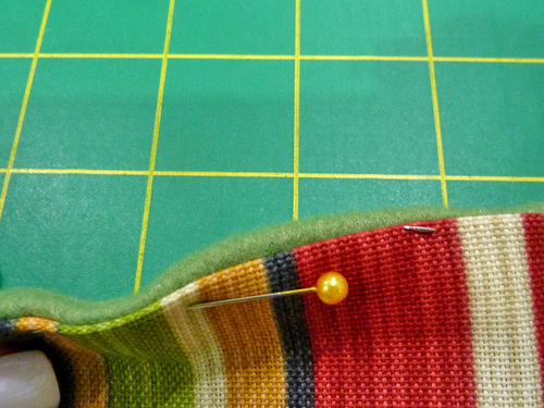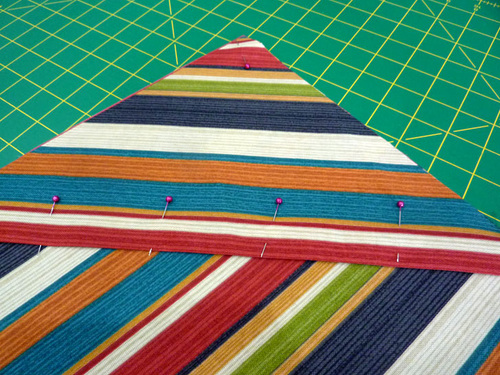 - Pin a triangle into each corner of the front and back panels. As shown in the drawing above, in our design, the corners with horizontal stripes go on the front panel and the corners with the vertical stripes go on the back panel.