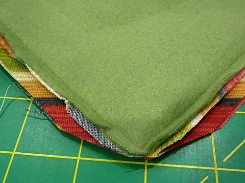 The two layers are held together with eight lines of topstitching through both layers. This stitching holds the layers flat during use as a picnic blanket as well as during laundering after the picnic is over.