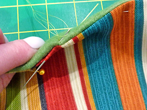- Thread a hand sewing need with thread to blend with both the front and back fabric (we used green) and hand stitch the opening closed with a tight slip stitch.