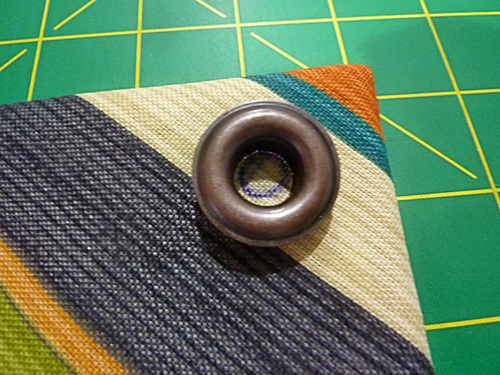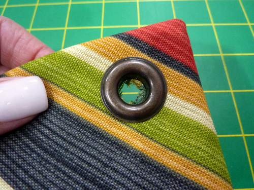- Mark for the four grommets, one at the point of each corner triangle, centering it 1” in from each side seam.