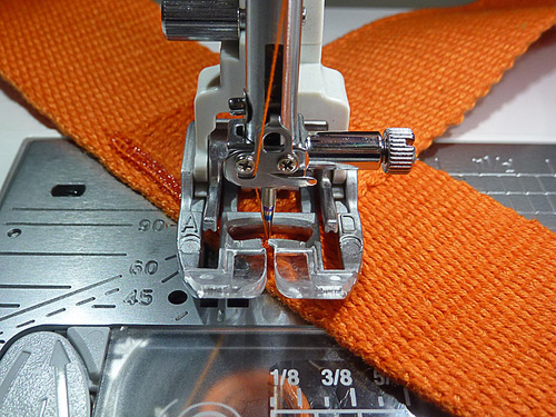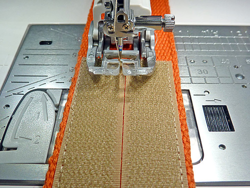 - Re-thread with thread to best match the Velcro® in the top and keep the thread to best match the belting in the bobbin. Keep a slightly lengthened stitch.