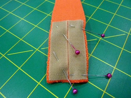 - Find the four 2½” lengths of Velcro®. Pull them apart. Place the two hook lengths (the scratchy half) side by side on one end of each 22” length of belting. Pin in place.
