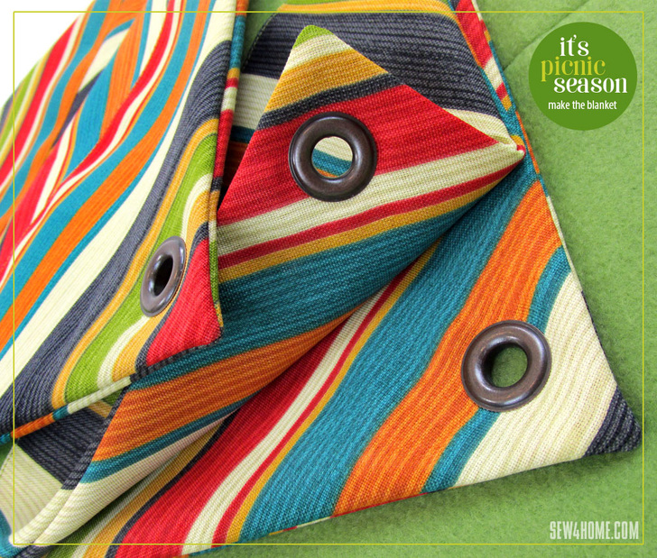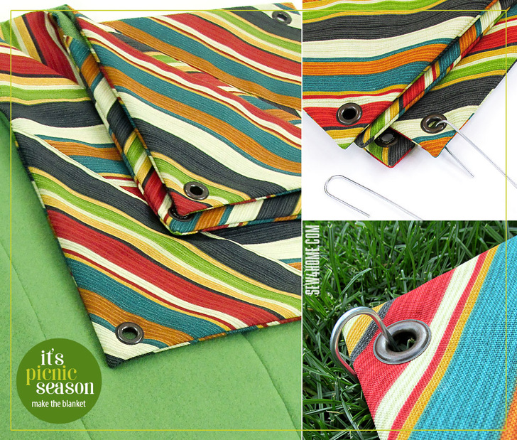 Each of the corners is reinforced with a double layer of the outdoor fabric and a grommet is added at the point. Use this handy little grommet to hold a “wind spike” that can keep your pretty blanket from shifting in the summer breeze.