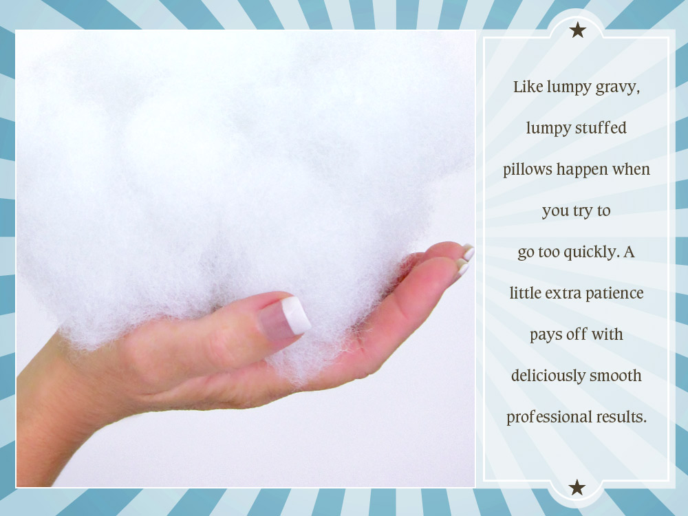 Is there anything worse than a lumpy pillow? Well… yes, there are probably lots of things worse, but ya gotta admit, a lumpy pillow is a real bummer. You may be under the assumption all fiber filling is created equal, and that you just punch it in to the pillow cover like you’re stuffing the Thanksgiving turkey. Well, take a step back all you S4H Stuffing Students, today we’ll discuss types of filling, quality cues to look for on the label, stuffing tool recommendations, and how to properly stuff your next pillow (or other stuffed project) so it looks super smooth and professional.