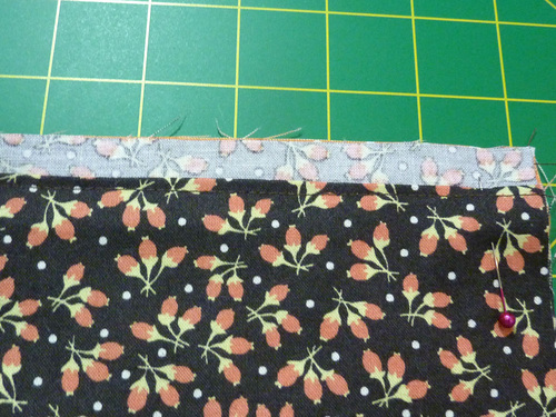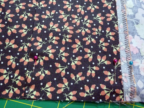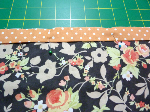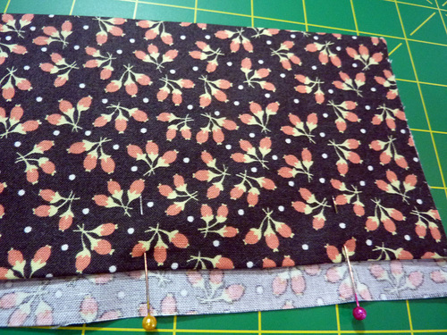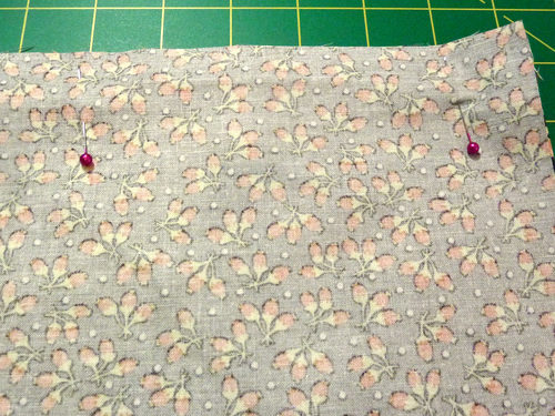 - Place one folded flange along one 21” edge of each main panel, aligning the raw edges. Pin in place. If you have a directional motif, you should be working with the “top” edge.