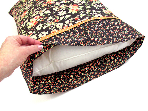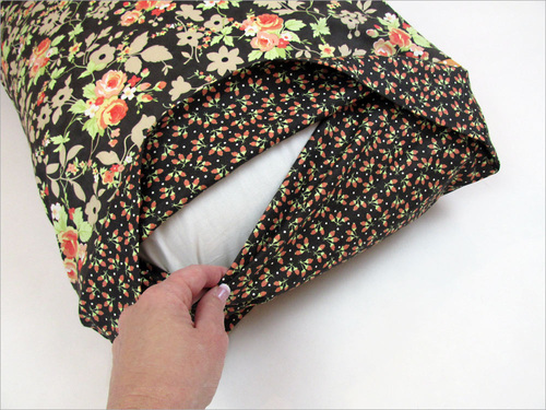 - Position the cover so what was the longer panel (the folded over panel with the narrow hem) is on the bottom. Insert the pillow into the cover.