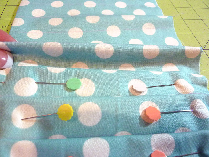 - Pin along the raw-edged side (the 27″ side) and across the bottom. The top remains open.