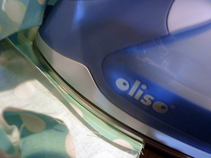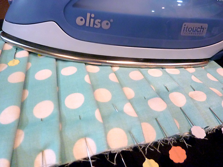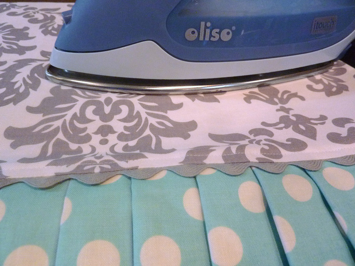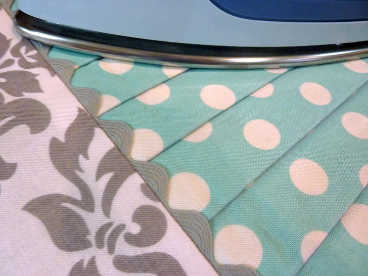 - Press the finished seam allowance towards the body of the pillowcase, at the same time making sure the rick rack is pressed down towards the pleats.
