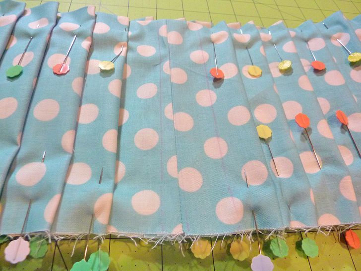- We pinned the pleats in place at both the top and at the bottom to hold them tight.
