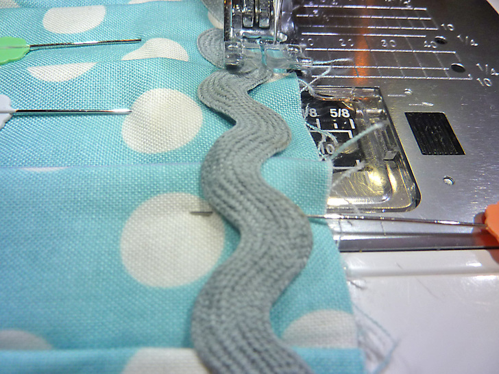 - Zig zag the rick rack to the pleated section, which means you are only catching the top waves in your stitching. Leave approximately 2″ of the rick rack free at the beginning and the end.
