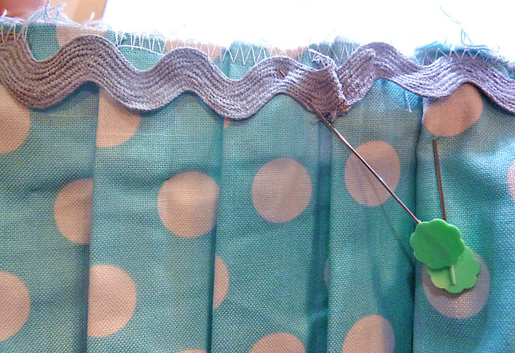 - Place the rick rack back into position against the pleated panel. You can put one or two pins in to hold this last little bit in place during the final seam.
