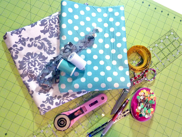 - 2 yards of 44-45″ wide cotton fabric for one pillowcase body and one pleated panel: we originally used Medium Damask in White/Grey by Riley Blake Designs