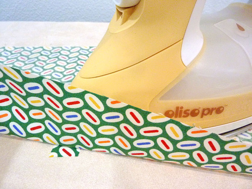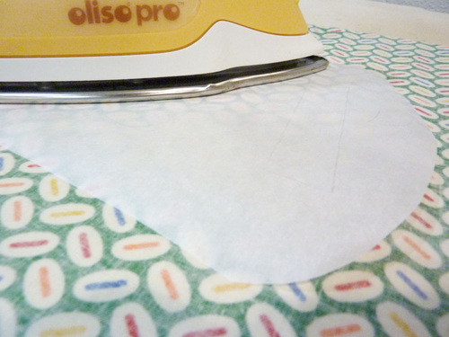 - Following manufacturer’s instructions, and using a pressing cloth or fabric scrap (what we did), fuse the appliqué to the pillow front.
