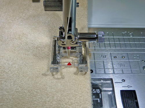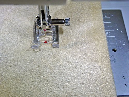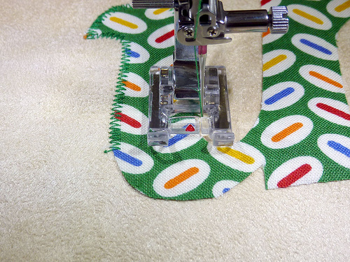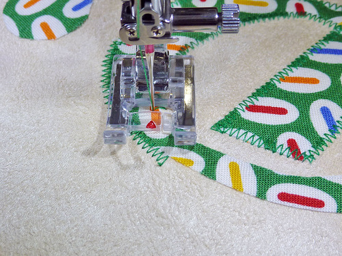 - Prepare to stitch all the way around again. This second round of zig zag stitching is the finishing satin stitch. Set the machine for a tighter stitch (we used 3.0 mm width, 0.35 mm length).
