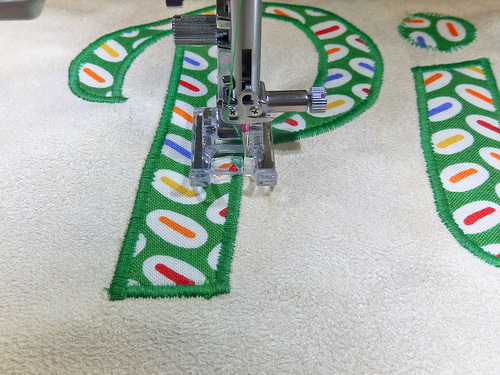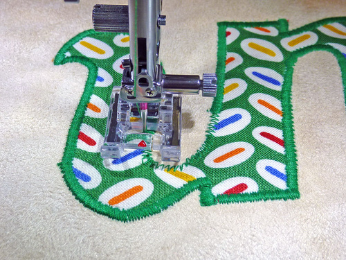 - Position the appliqué under the foot so the right swing of the needle is off the edge of the fabric and the left swing of the needle is into the appliqué.