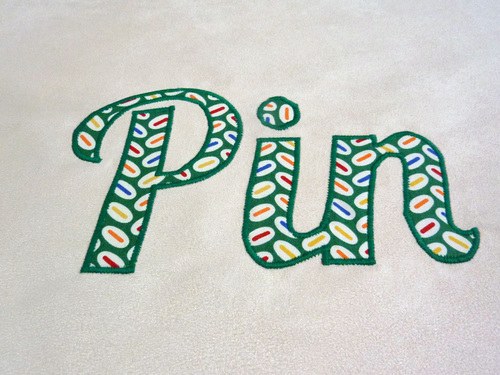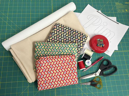 The Pin, Cut, and Sew appliqués are a standard quilting cotton in a small print. We used the bright primary colors of Pezzy Beans by American Jane for Moda Fabrics. This is an older collection we had in our stash, and is no longer readily available in-store or online. However, any small, repetitive motif would work well. You want something that will show up well within the letter shapes. You could even look for a fabric with a small sewing motif.