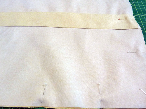 - Place the panel with the narrow hem right side down overlapping the first panel until you create a perfect fit to the 16″ x 16″ square. Pin in place.